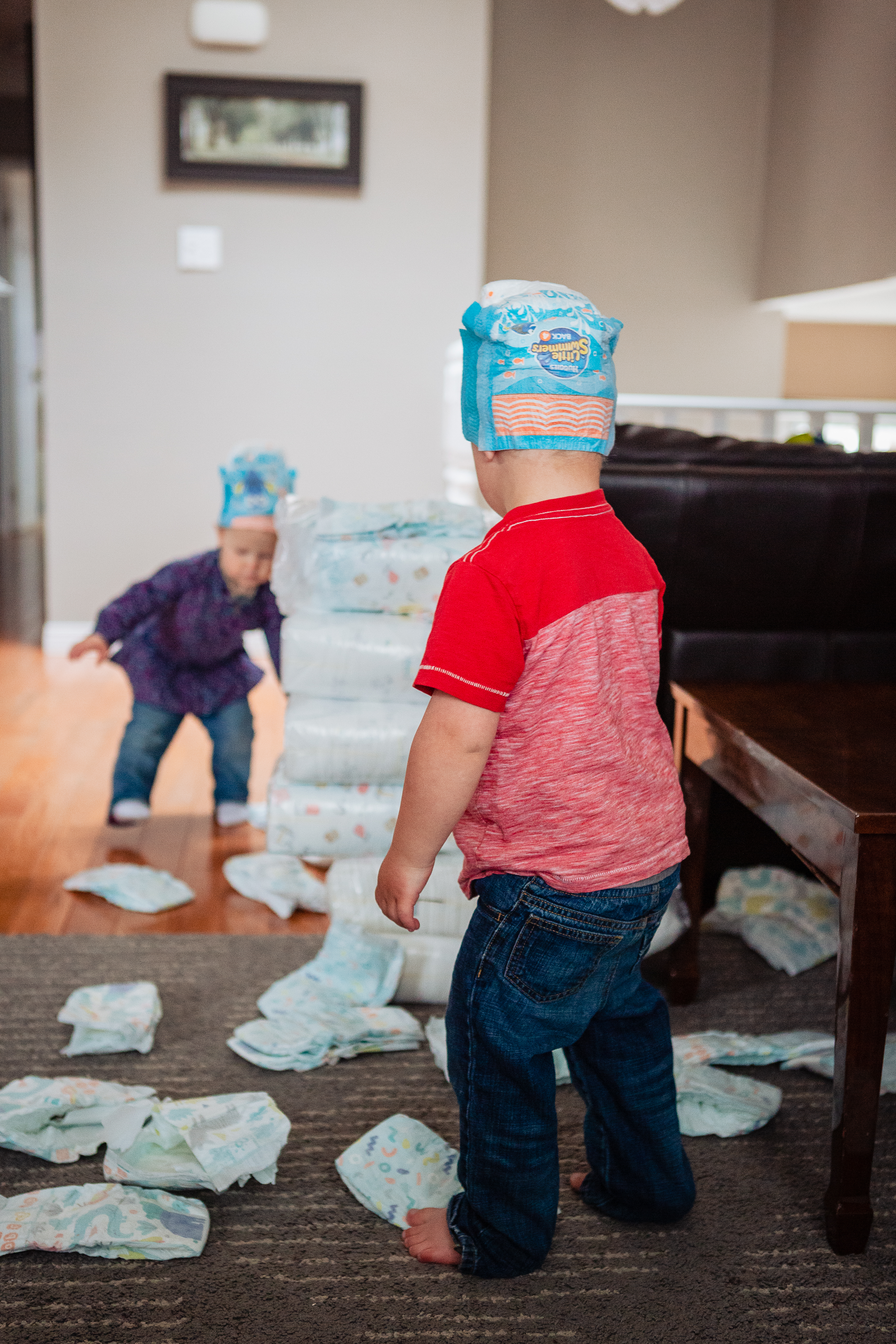 During Bible time one day, Jason brought a diaper to me, and then Adele caught on, and then more and more diapers were brought on, til it was one big joke - and they were wearing them on their heads and having a great old time.